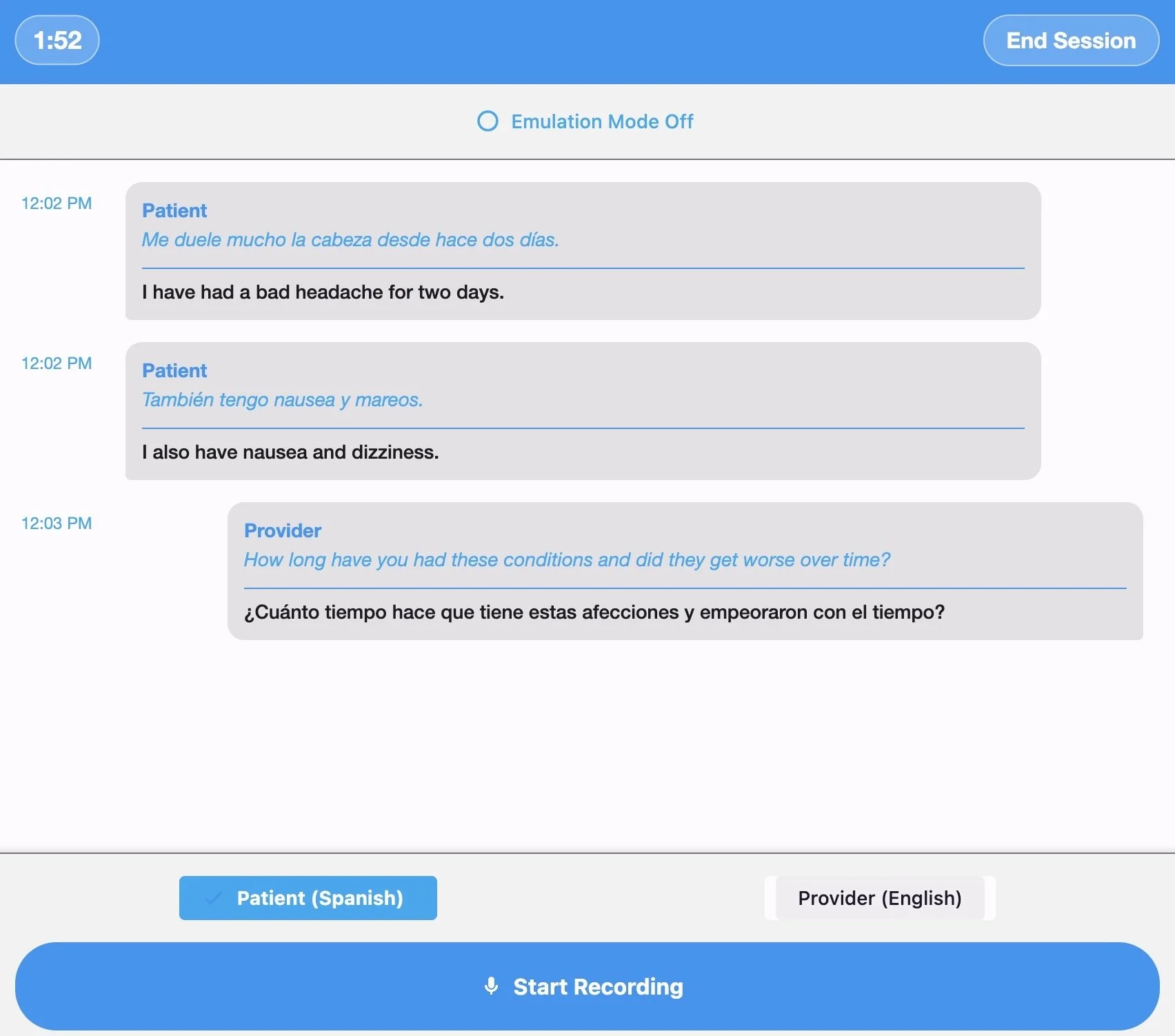 Instant, accurate translation of conversations and medical terminology through simple web and mobile interfaces optimized for clinical workflows